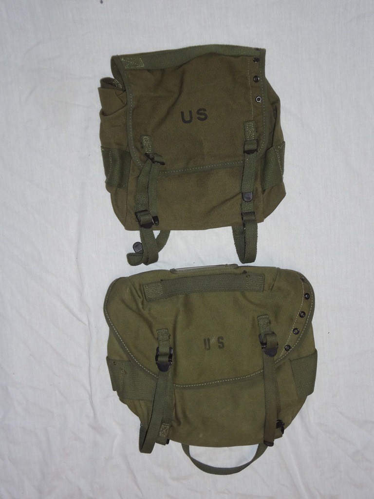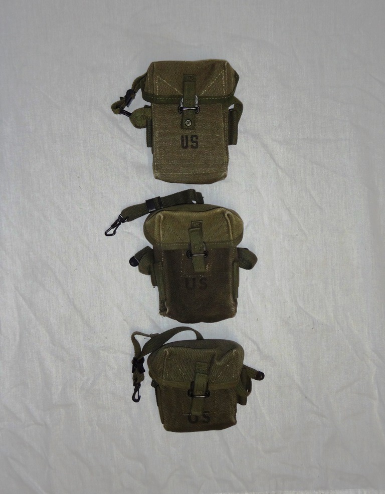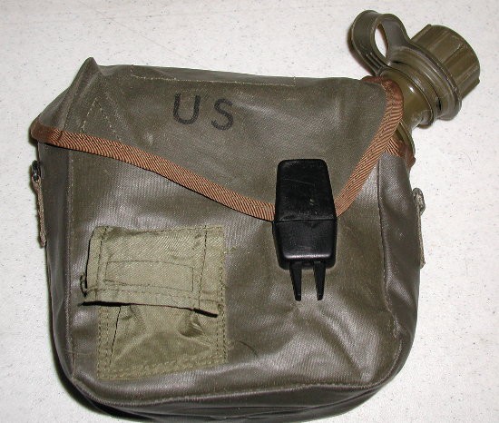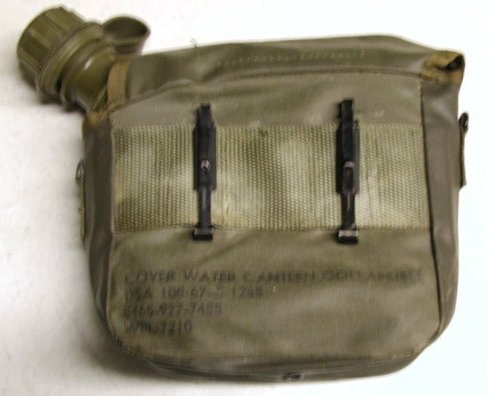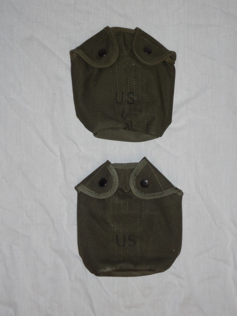 The first and second photos are the 1st. Pattern 2qt Canteen from the Vietnam War. Introduced in 1963 and made through 1964, this pattern featured a removable bladder and integrated shoulder strap with a "lift the dot" fastener. The second variation of this cover, or the "2nd. Pattern" (see third and fourth photos) used the same bladder, but the carrier was redesigned with belt clips as opposed to the shoulder strap and it used a velcro closure and a pocket was added for water purification tablets. These were manufactured in late 1965 and 1966.