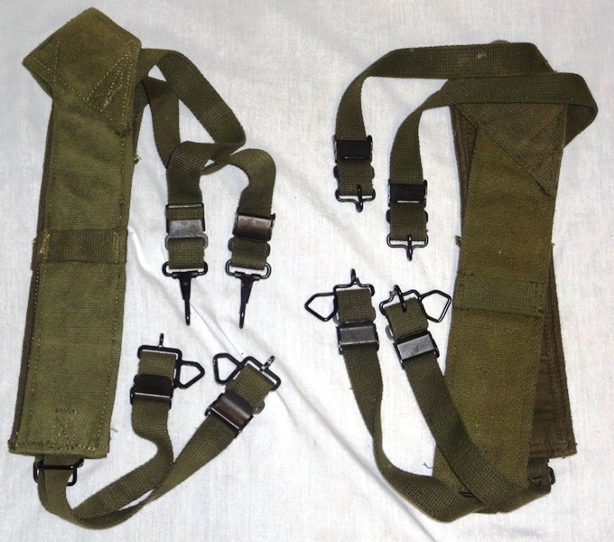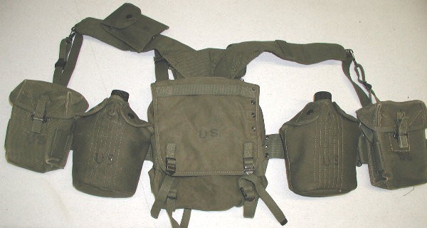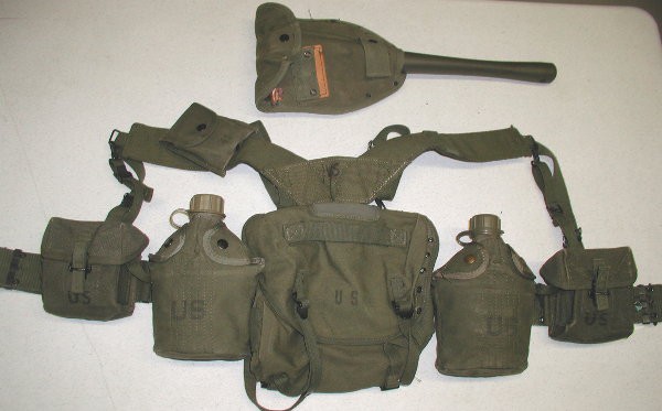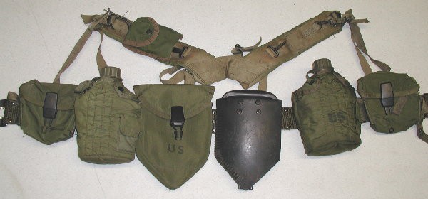 Equipment Belt, Load Bearing Suspenders, Canteen with Cup and Cover (2), Small Arms Ammunition Pouch (2), Combat Field Pack, First Aid Case, Entrenching Tool with Cover.