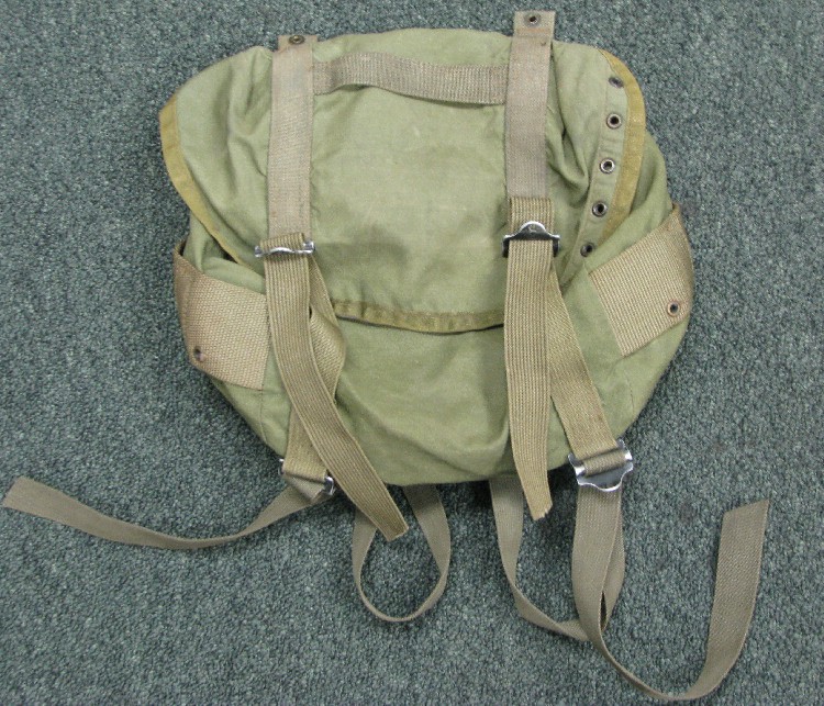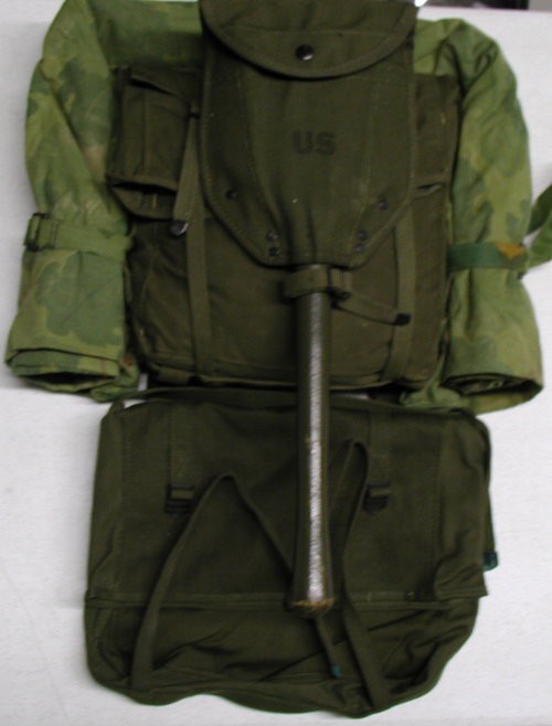 Note that the cotton equipment has been replaced with nylon and that the metal snap closures have been replaced with plastic. The plastic would soon be replaced by metal as it was found to be too fragile. Also note the redesigned tri-fold shovel. This gear was put together for reference purposes only and it should be noted that the M-67 nylon gear was issued in pieces and not as complete sets. I have never seen a period photo where a soldier has all 67' gear. See below for Tropical Rucksack.