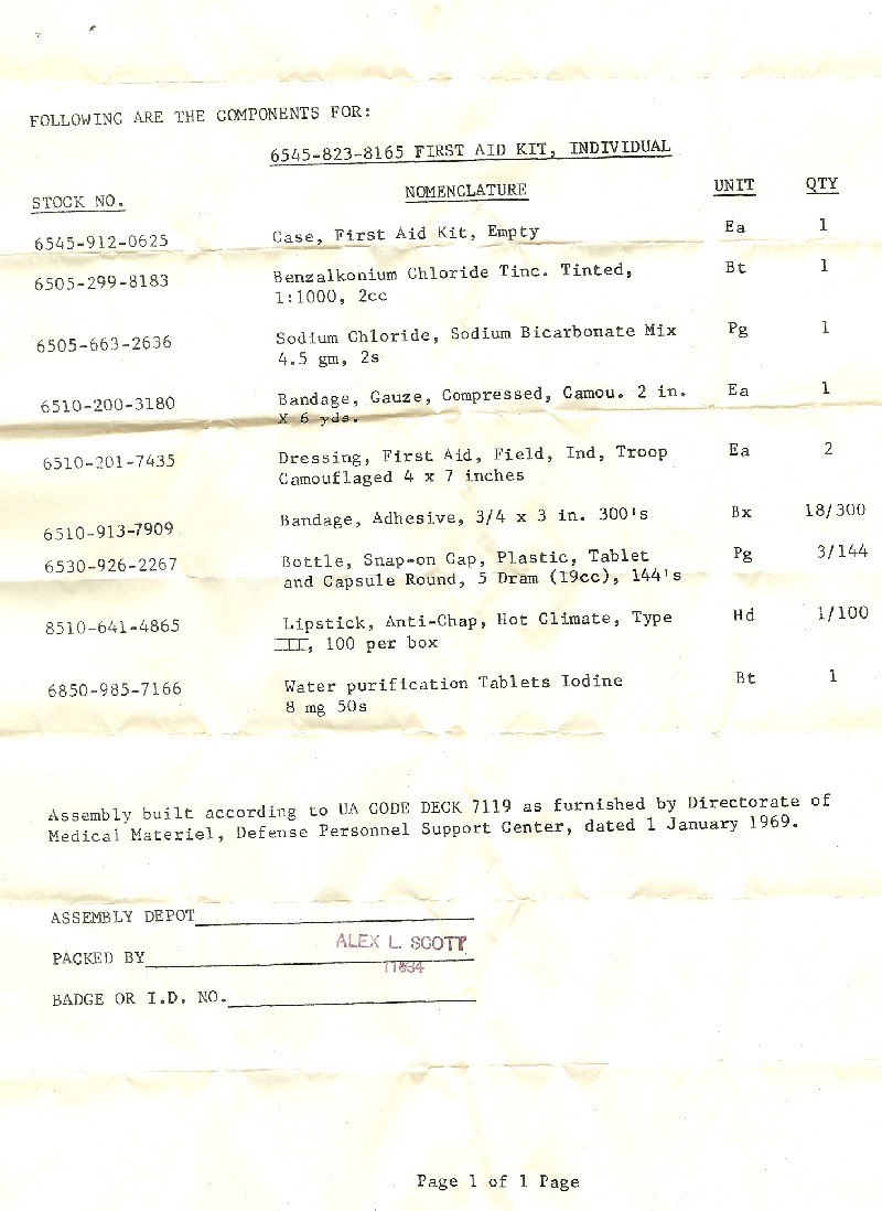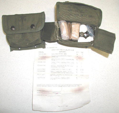 To the left are pictures of the first aid pouch packed with contents, the contents laid out, and a scan of the original packing list.