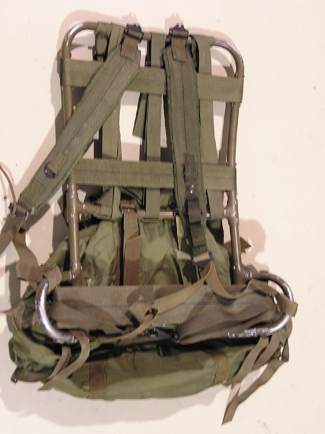 The lightweight rucksack is the primary Ruck used in the Vietnam War and is the "standard" for an infantryman. There are several minor variants of the Lightweight Ruck, but all have consistent main features. The rucksacks consists of a tubular aluminum frame and detachable nylon bag. The frame has multiple straps (shoulder straps, upper horizontal strap, mid horizontal strap (introduced in 1968), lower back support strap, cargo straps and buckles, and a waist strap. The straps attach directly to the frame and not to the bag. The bag is made of nylon and has three external pockets and one main interior pocket. The bag could be attached in either the upper or lower location on the frame.