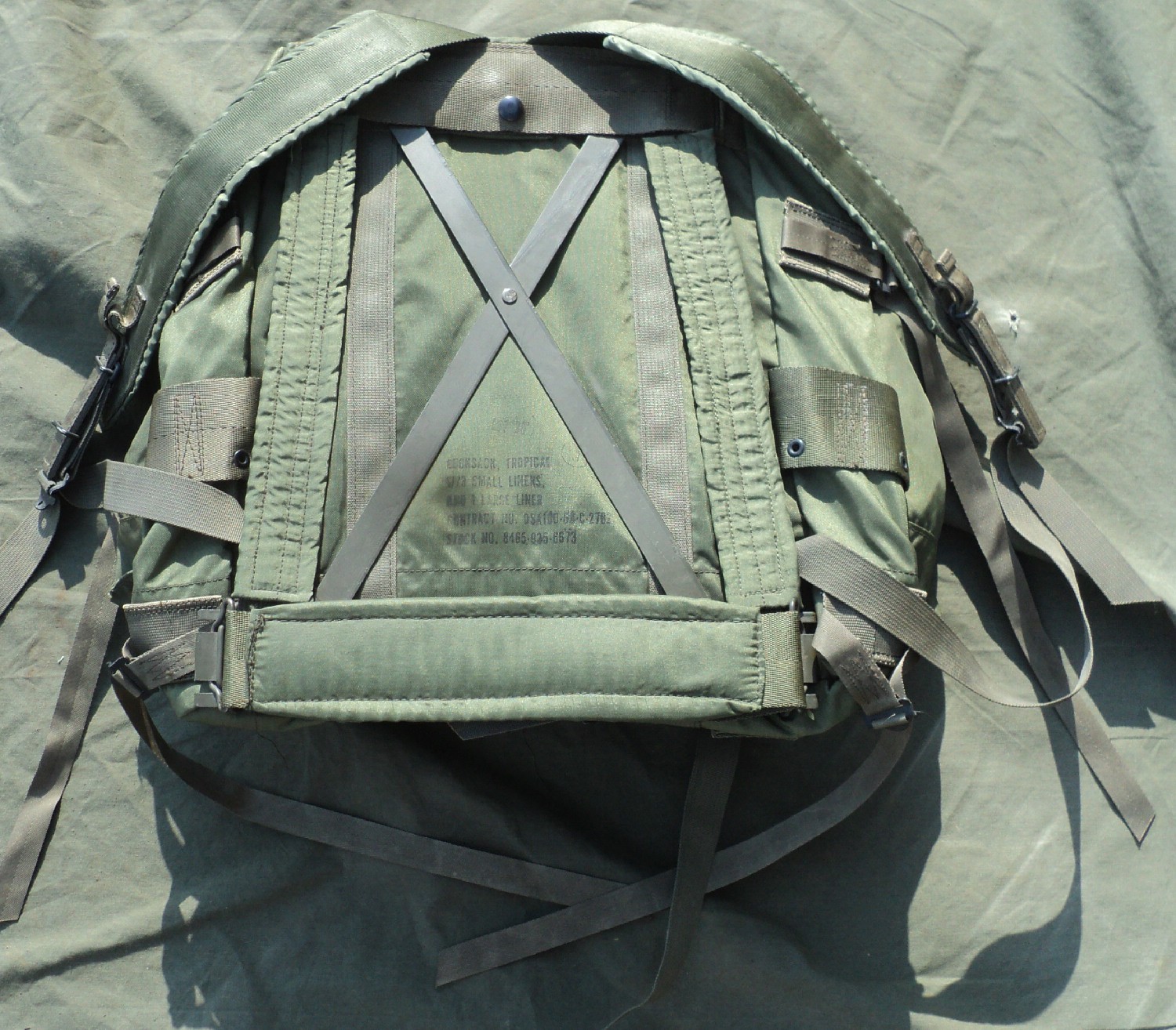 The Tropical Rucksack was introduced in 1968 as part of the M-67 equipment. The 1968 dated example that I have has the early plastic snaps on the pockets like all first issue 1967 gear. It was first issued to "priority" units including Special Forces, Rangers, and Divisional Recon. It would be more common to see the Lightweight Ruck in a line unit in 1968 than the Tropical Rucksack. This Ruck is easily identified as it has an integrated frame in the shape of an "X" that can be seen looking at the side of the Ruck that goes against your back. This pack was bigger than the lightweight rucksack, but incorporated the same basic ideas of a large compartment with three external pockets.