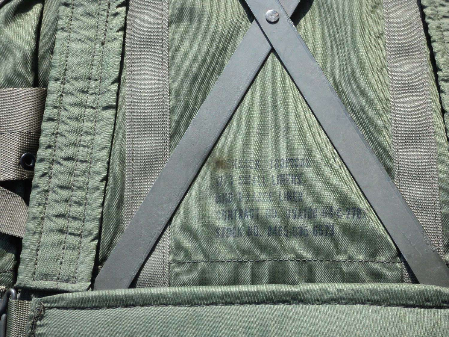 In 1965, the production of the rucksack frame and lower back supporting strap were simplified. The frame was changed to a riveted design vs welded. This eased the manufacturing process and reduced the weight slightly. The lower strap was changed to a simple 2" wide web with buckle and the bell shaped closure on the main compartment is now brown vs. clear. The waist strap is a simple 1" nylon webbing with D ring and snap hook. Collectors will often refer to these as P-65 rucksacks for clarification. They are the beginning of the "standard" rucksacks.