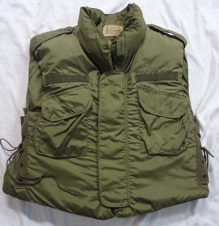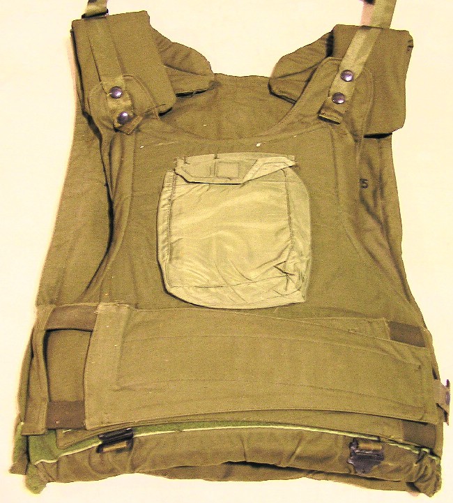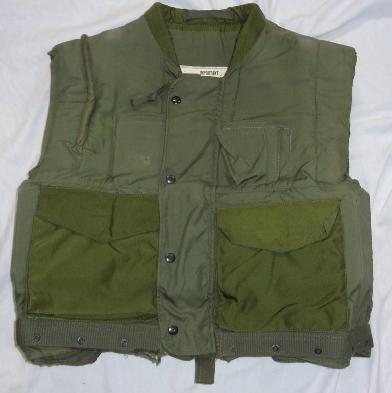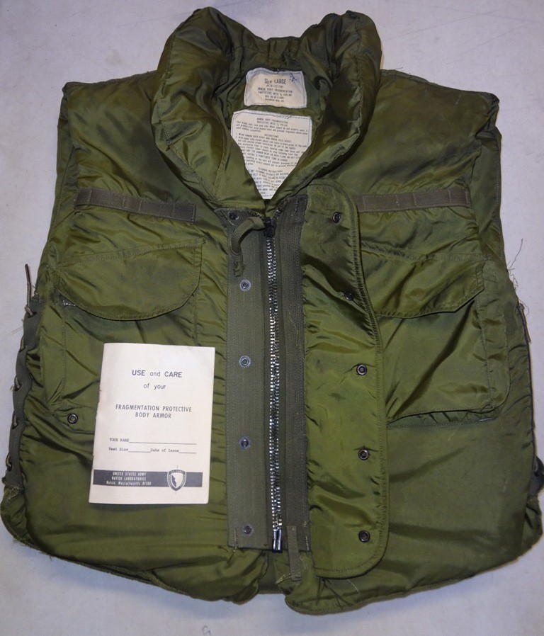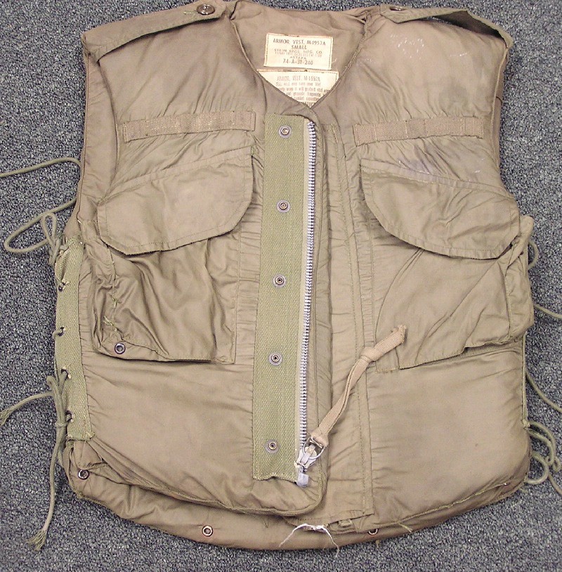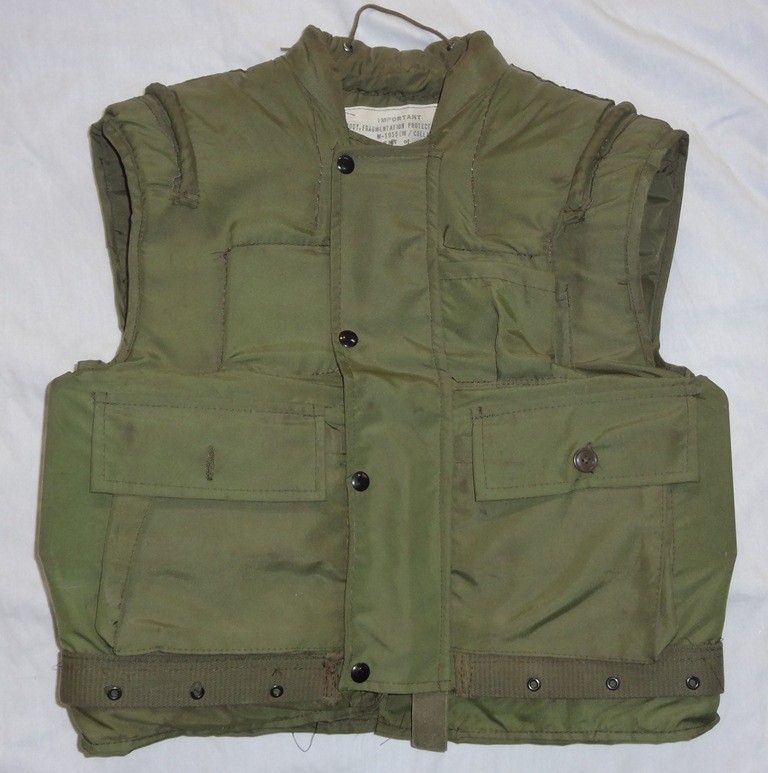 The standard Army infantry vest at the beginning of the war was the M1952A from the late Korean War era. It would be the most commonly seen fragmentation vest in Army use through 1966. The vest is easily distinguished by its brown color, lack of a collar, and epaulettes on the shoulder. It features a zipper front with nylon over flap. This style of vest would remain popular with vehicles crews as the lack of a collar make it more comfortable to wear with a helmet. When looking at ways to improve the vest, the first thought, aside from more effective materials was to increase the area of protection. The new vest was very similar to the M52 in basic design: zipper front, two pockets, lace sides, etc. but it featured a collar. Hence they were labeled as Armor, Body Fragmentation Protective, With, 3/4 Collar.