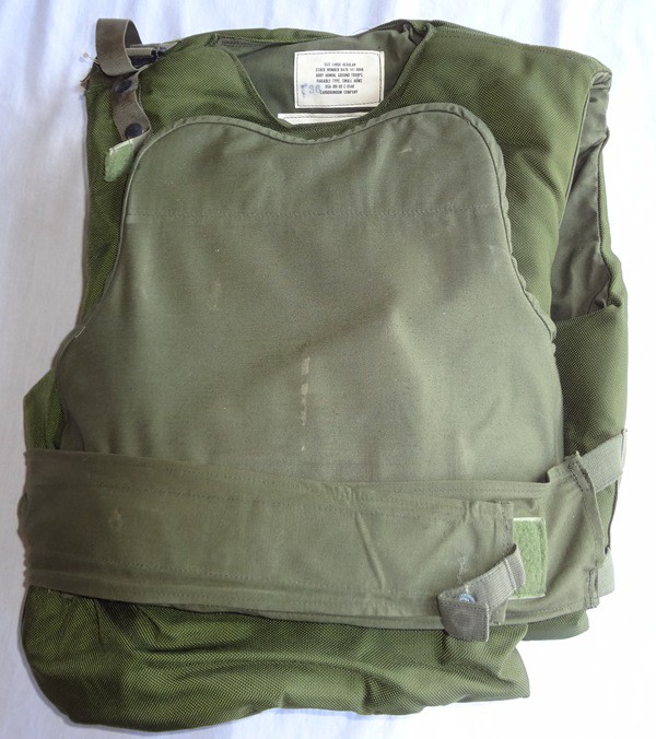 From left to right: USMC M-55 Fragmentation Vest, 1st variant. This style came out in 1955 and features hard, overlapped Doron plates inside a cotton shell. The vest has a zipper front and no pockets. This version was made into 1967 when the second version was introduced with the addition of nylon pockets (2nd photo). Another version of the vests is shown in the 3rd photo. This vest has a rope ridge on both shoulders and the shell is made of nylon vs. cotton. The final photo is of the Marines answer to the Army Variable Armor system. This was an experimental vest manufactured in 1971. It used ceramic plates in a nylon ERDL carrier and featured a built in pack on the back of the vest carrier.