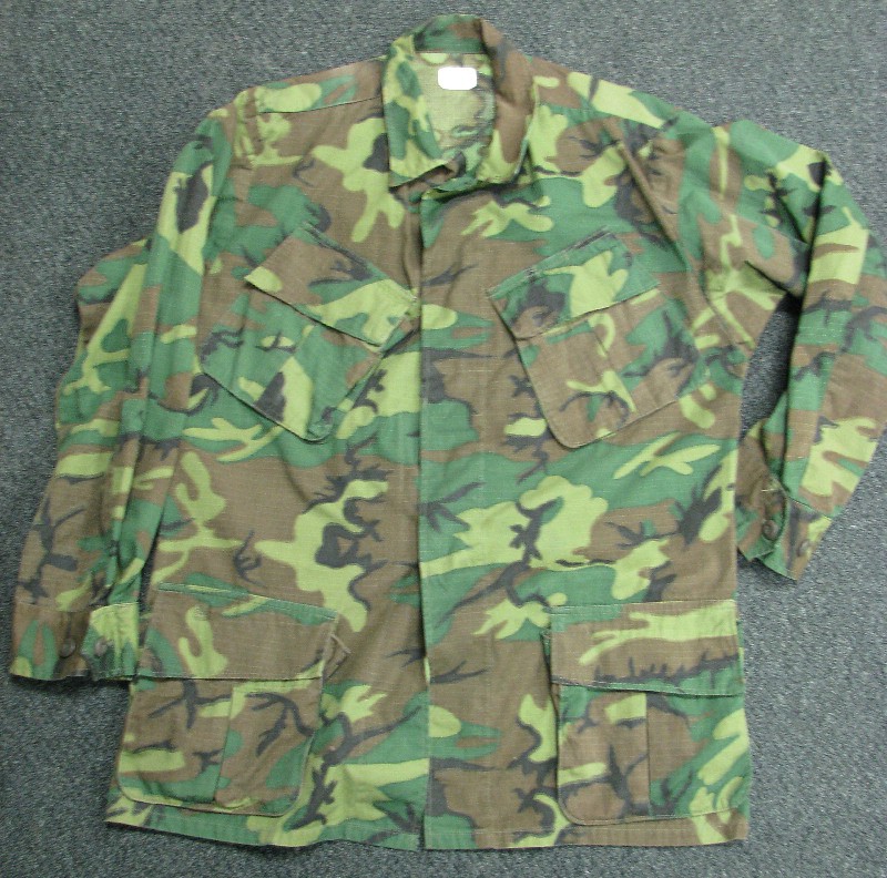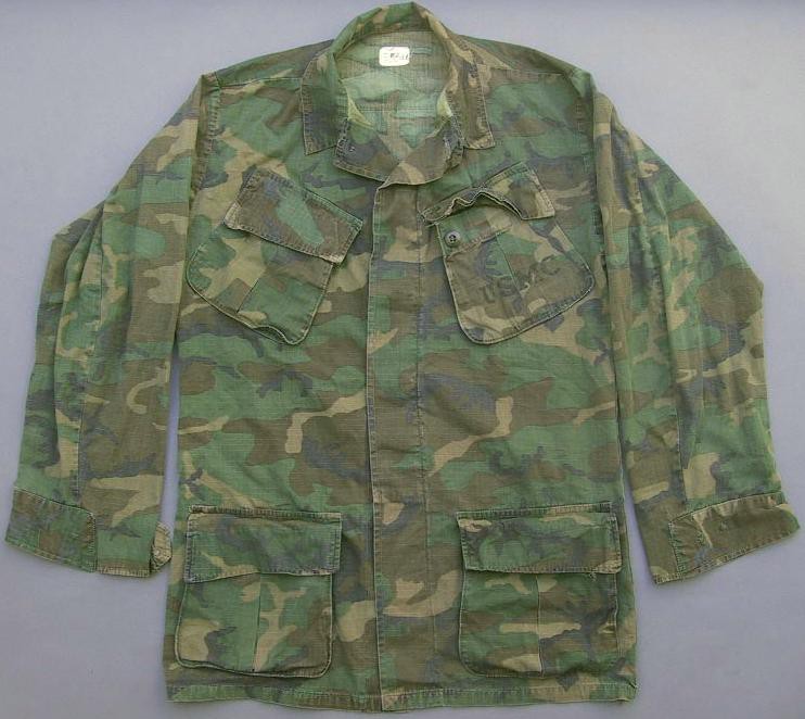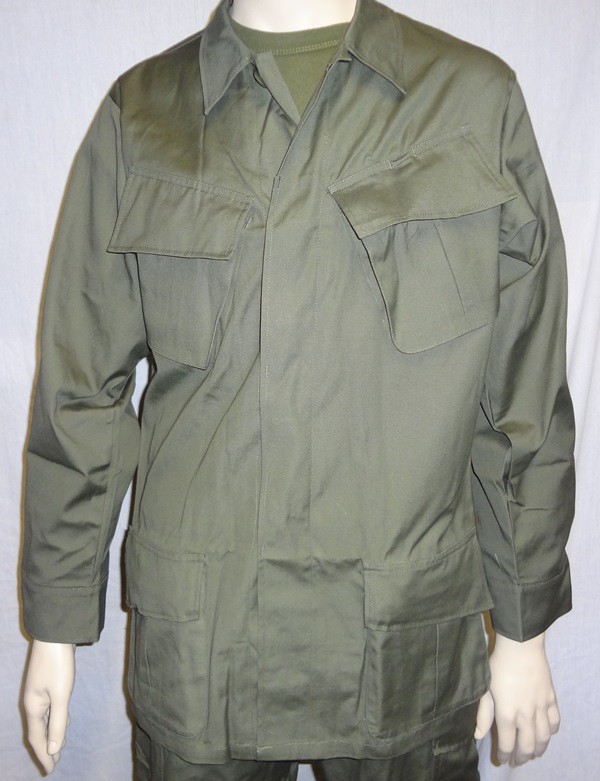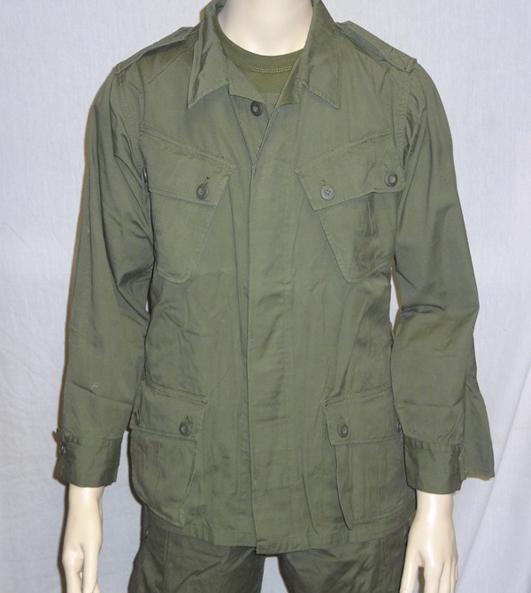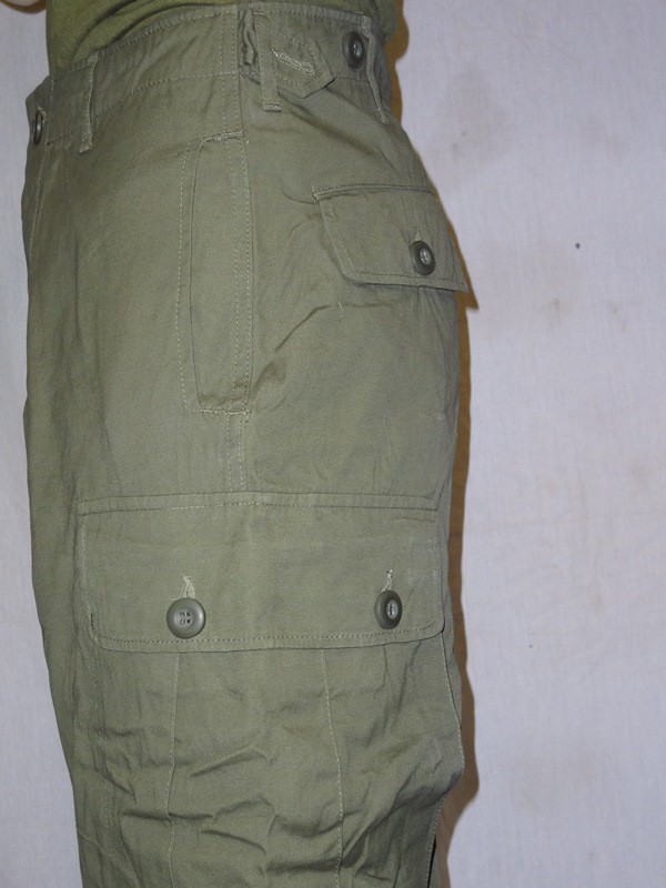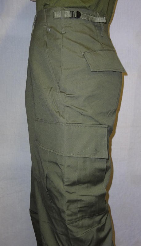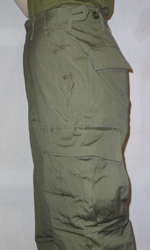 All of the Tropical Combat Uniforms (herein known as jungle fatigues) shared several basic characteristics. The coat consisted of two slant pockets on the chest and two lower bellows pockets. Each of these pockets closed with two buttons and the coat had a button front closure. The pants consisted of two hip pockets with single button closure, two slash pockets at the hips and two bellows pockets on the thigh with dual button closure. The left thigh bellows pocket also had a "hidden" survival pocket located inside. The pants could be either button fly or zip. A "quick check" to tell modern pants from Vietnam vintage is to check for: 1) VN era pants do not have seat re-enforcements, or knee re-enforcements 2) VN era pants have one button for each hip pocket, not two as on modern pants 3) VN era pants have the "hidden" pocket inside the left thigh bellows pocket.