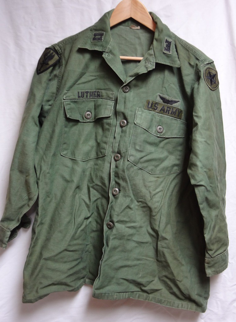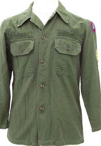 There are three basic types or "patterns" for the OG-107 Cotton Sateen Utility Uniform. The uniform was the standard for both stateside use and overseas deployment at the beginning of the Vietnam War. As the Tropical Combat Uniform (jungle fatigues) became more plentiful in Vietnam, they began to replace the OG-107 Uniform in combat units. A rough timeline is that line infantry units from "standard" divisions (non airborne and SF) began receiving jungles in the Spring of 1966 and the OG-107 was slowly relegated to use in rear areas. In the United States and foreign postings (outside of SE Asia), the OG-107's remained the standard uniform throughout the 1960's and 70's. This is one of the longest issued uniforms by the US Military seeing use from 1952 until the adoption of the Woodland Pattern BDU in 1982.