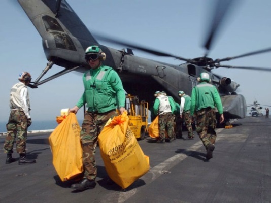 Forty years after the end of the Vietnam War, the United States Navy still uses bright yellow mailbags. Image courtesy of the Unites States Postal Service Museum